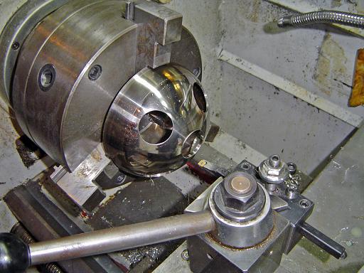 | Boring hemisphere (3/18/2007) A boring head is used to increase the hole diameter to 1.495" ID. |