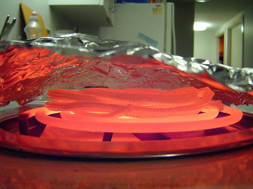 | Plasma limiter bake out (03/26/2008) Due to plasma bombardment damage to the o-ring and out gassing in preliminary tests an alumina fabric plasma limiter was installed to shield the o-ring. The limiter was baked out at 950F for 60 min to remove any binders added in the manufacturing process. |